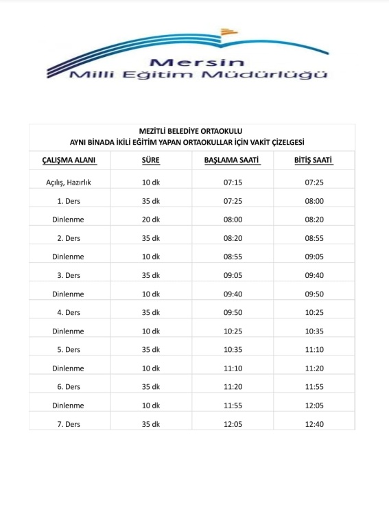 2025-2026 eğitim-öğretim yılının başlangıcında sizlerle önemli bir bilgiyi paylaşmak istiyoruz. Bakanlığımızın 01.09.2025 tarih ve 139238295 sayılı emirleri doğrultusunda, Mezitli genelinde deprem nedeniyle yıkılan okullar için alınan ortak karar neticesinde, ders saatlerimizin süresinde değişikliğe gidilmiştir.